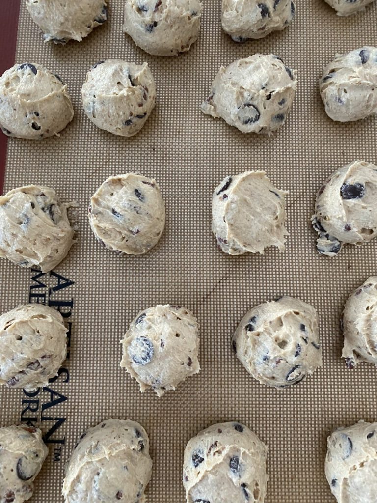 6. Répartir 6 boules de pâte à biscuits congelée par plaque en les espaçant.