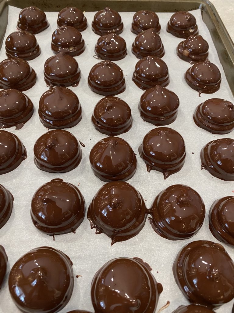 11. Tremper les biscuits un à un dans le chocolat et utiliser une fourchette pour les retirer.  Bien secouer pour enlever le surplus de chocolat.